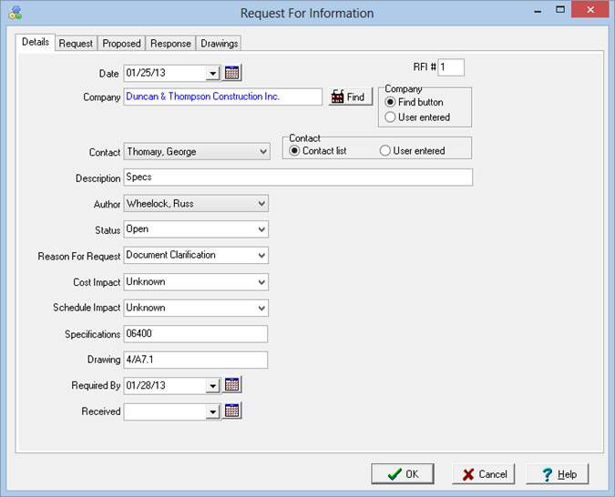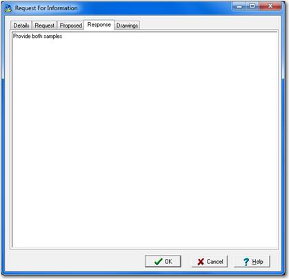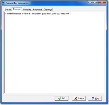 To add a new RFI, right mouse click the RFI grid and select “New” from the pop up menu. This brings up the “Request For Information” dialog box which allows you to enter all of the information needed for the RFI.