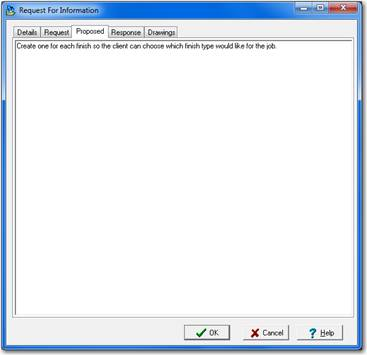 This tab allows you to type in the response from the customer after they have sent their response back to you. By typing their response into ShopPAK you now have one place to view all information about an RFI without having to go find the paper copy. This field can be up to 1000 characters long.