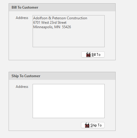 The fifth sub tab, “Address”, contains customer and ship to addresses. Click “Customer” to change the customer mailing address. Click “ShipTo” to change the shipping address, or type the shipping address manually, directly into the “Ship To Customer” edit box.