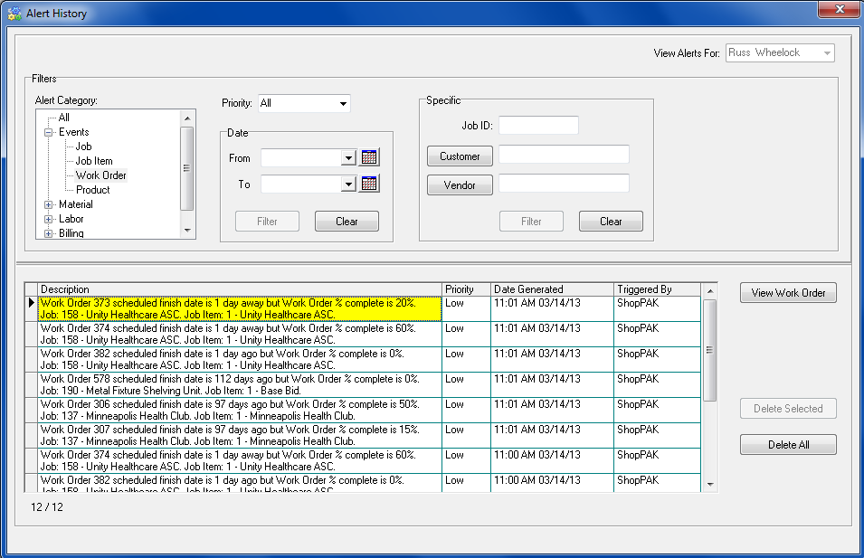 Since the alert is work order oriented, ShopPAK changes the “View” button’s text to say “Work Order. Clicking the “View Work Order” button automatically navigates to the Jobs tab, opens and adds the job to the job tree, selects work order #373, and displays the work order details form.