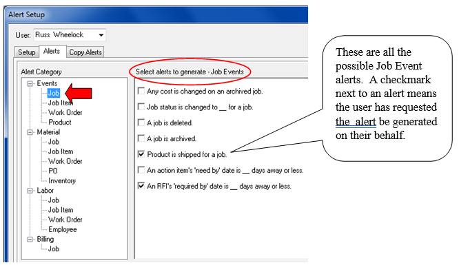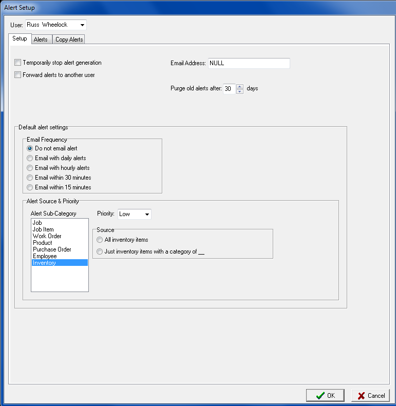 Select Define | Alerts from the ShopPAK menu to display Alert Setup. Define user specific alert default behavior, and most importantly, choose and configure alerts for users.