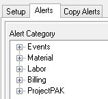 This tab is used to create and configure alerts. There are lots of candidate alerts to choose from. They are organized into 5 broad categories -> Events, Material, Labor, Billing and ProjectPAK: