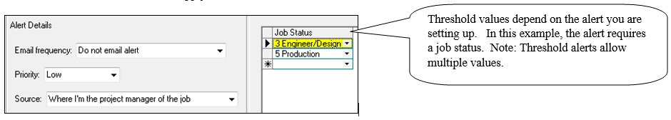 In the above example, the alert will be generated if the user is the job’s project manager and job status changes to either “3Engineer/Design” or “5 Production”. The alert will not be emailed. It will be given a priority of low.