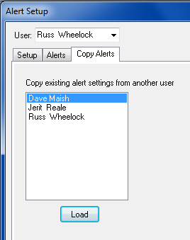 2. Click the Load button. This reads every alert the selected user has created and creates a copy of each alert and assigns them to the target user.