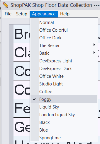 Appearance To change the look of the PC data collection workstation screen, click Appearance to view the drop down listing. Click on on one of the listed skins to select. A check mark denotes which skin is selected.
