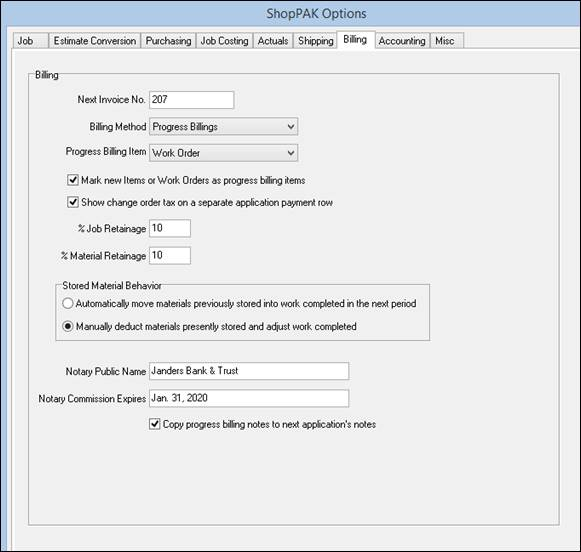 If you use the same notary on all your progress billings, enter the notary commission expiration date and ShopPAK will automatically fill in this field on the generated AIA Progress Billing document.