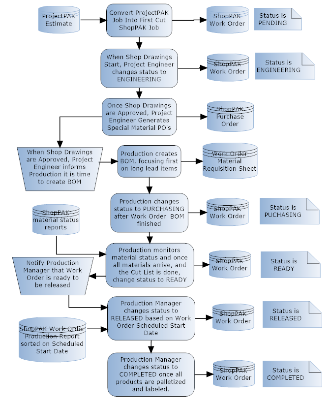 Every new customer should analyze and document their ShopPAK procedures and work flows. One of the most important procedures deals with changing work order status values. In particular, define what each status value means, who changes work order status, when to change work order status, and what are the related steps and consequences when a work order status changes. Following is an example of a ‘Work Order Status Change’ procedure from an actual customer.