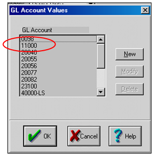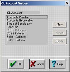 In ProjectPAK, selecting Define | GL Accounts from the menu displays the “GL Account Values” dialog box.