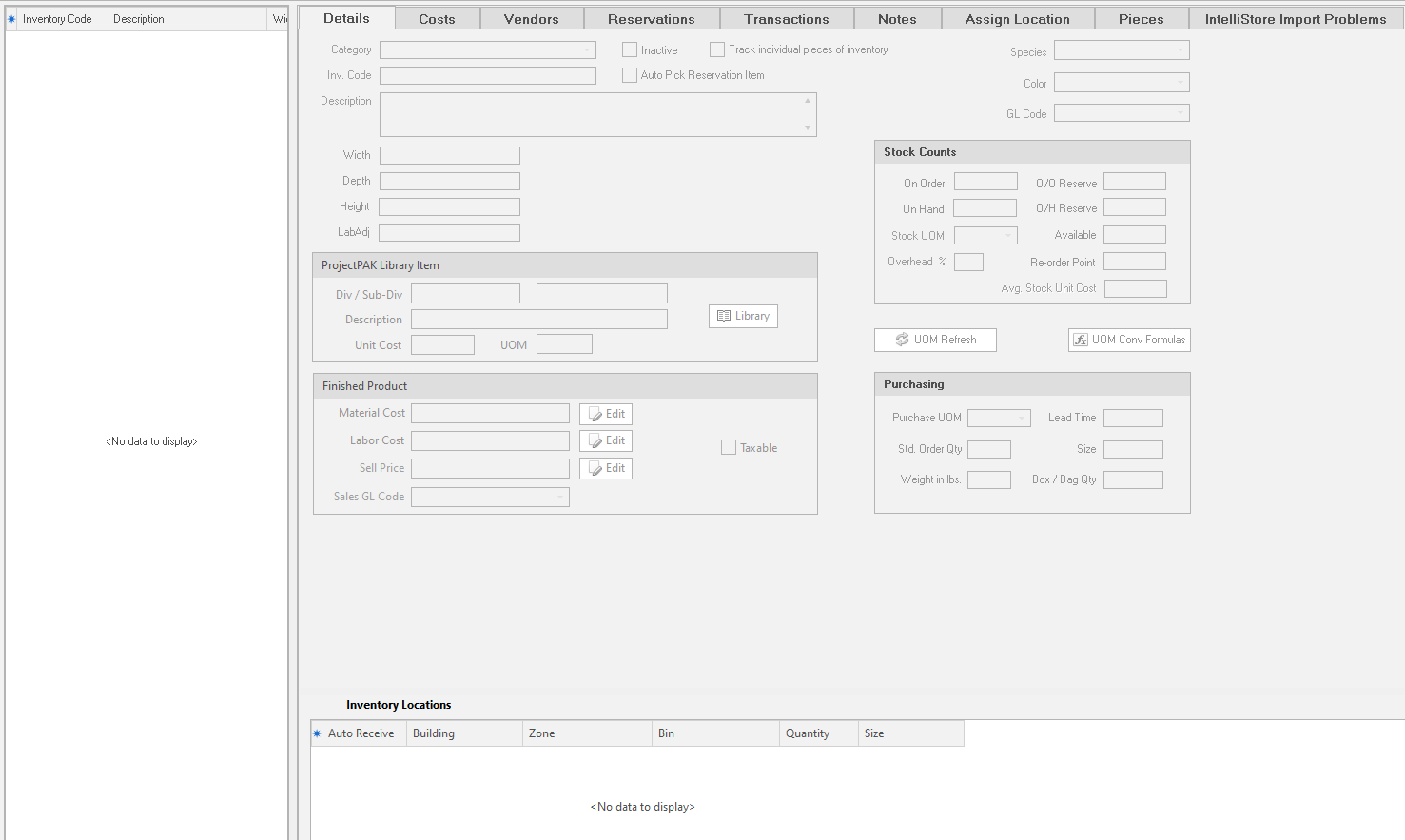 The first six Inventory Form tabs display information that relates to the currently selected Inventory List item. However, the “Assign Location” and the “Pieces” tabs don’t pertain to the currently selected Inventory List item. These tabs work independently and can contain information on a number of inventory items.