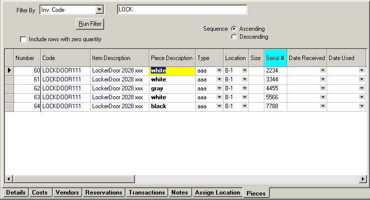 A nice feature of the “Pieces” grid is you can sort the grid on a number of columns, as well as, sequence rows by ascending or descending order. The column currently being sorted has an aqua background. To sequence on another column, click the column header with your left mouse button.