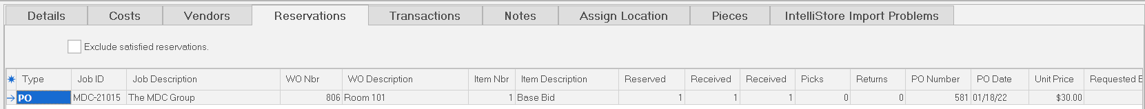 The fourth sub tab, “Reservations” contains a ‘read only’ grid that lists the reservations that have been placed against the active inventory item.