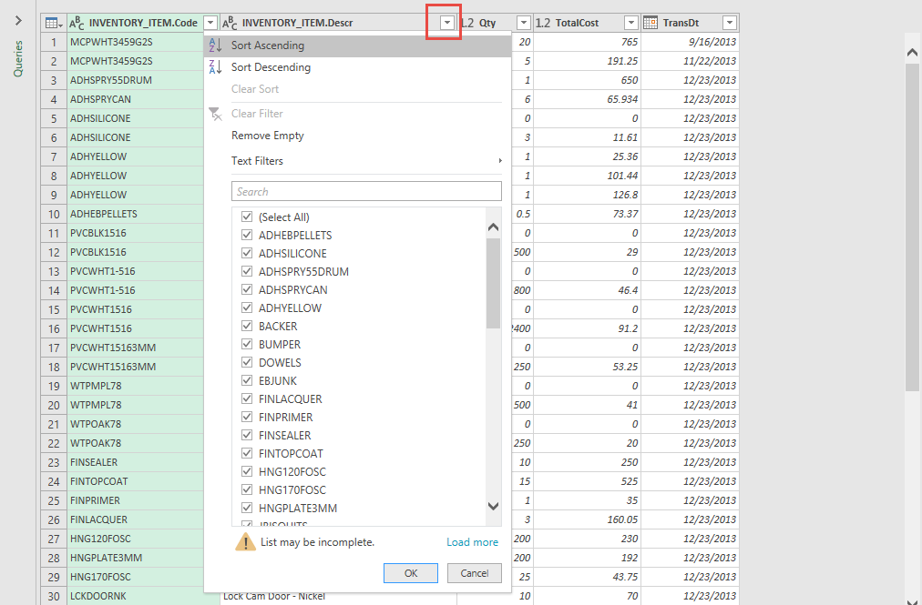 You can filter or sort a column by clicking the drop-down to the right of the column name