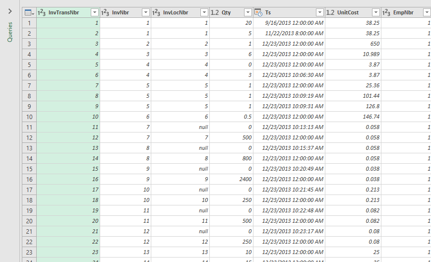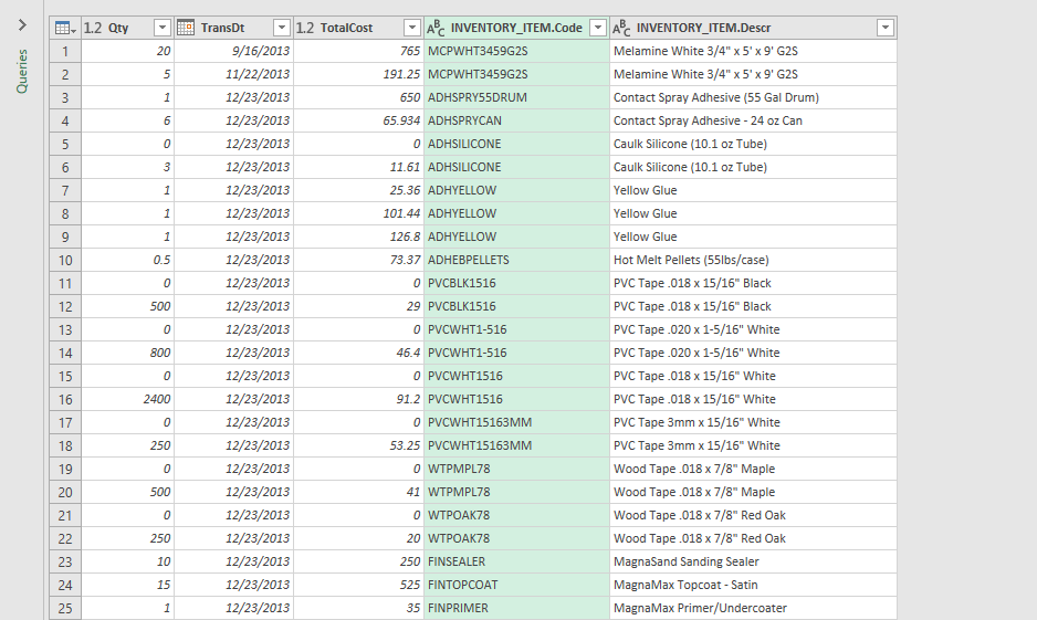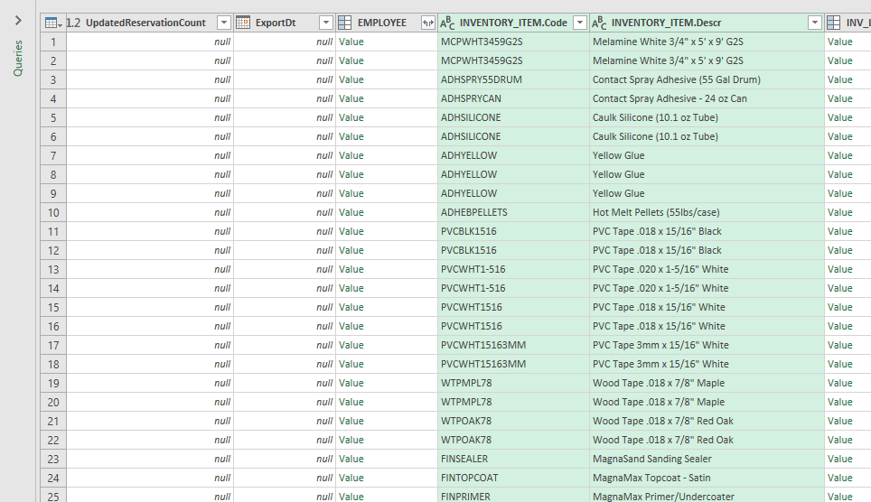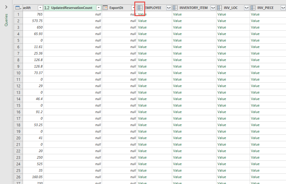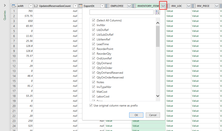 If you need individual columns from a related table select them in the dialog box and click OK. It will add them to the grid as individual columns, label the column with the table name followed by a period and the column name, and shade them green.