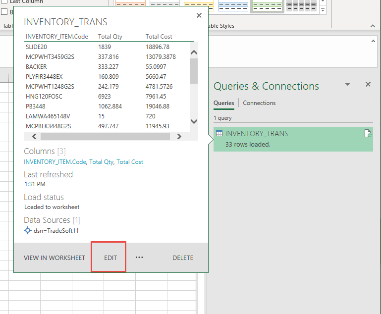 To open the query up to edit it after it has been returned to the worksheet hover over the query name in the right-hand ‘Queries & Connections’ (it is labeled ‘Workbook Queries’ in 2013 & older) panel and select ‘Edit’.