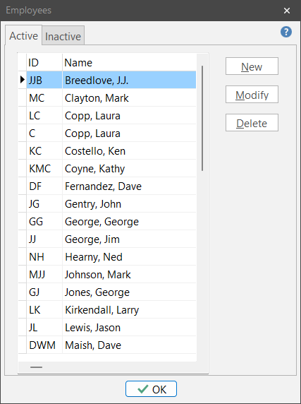 Use the “New” and “Modify” buttons to create or edit an employee. To delete an employee, highlight the employee and push the “Delete” button.