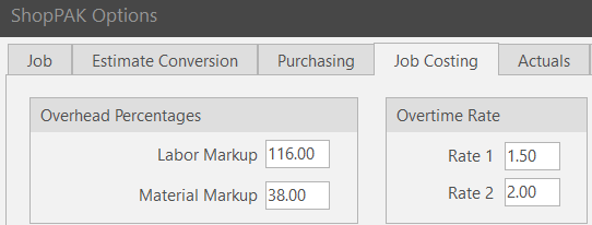 If you apply overhead as a percentage, type in the percentage and tab. ShopPAK calculates the “Overhead Cost”. When inserting a ‘New’ employee Wage record, this value will default to the ‘Labor Markup’ setup in ShopPAK Options, Job Costing tab.