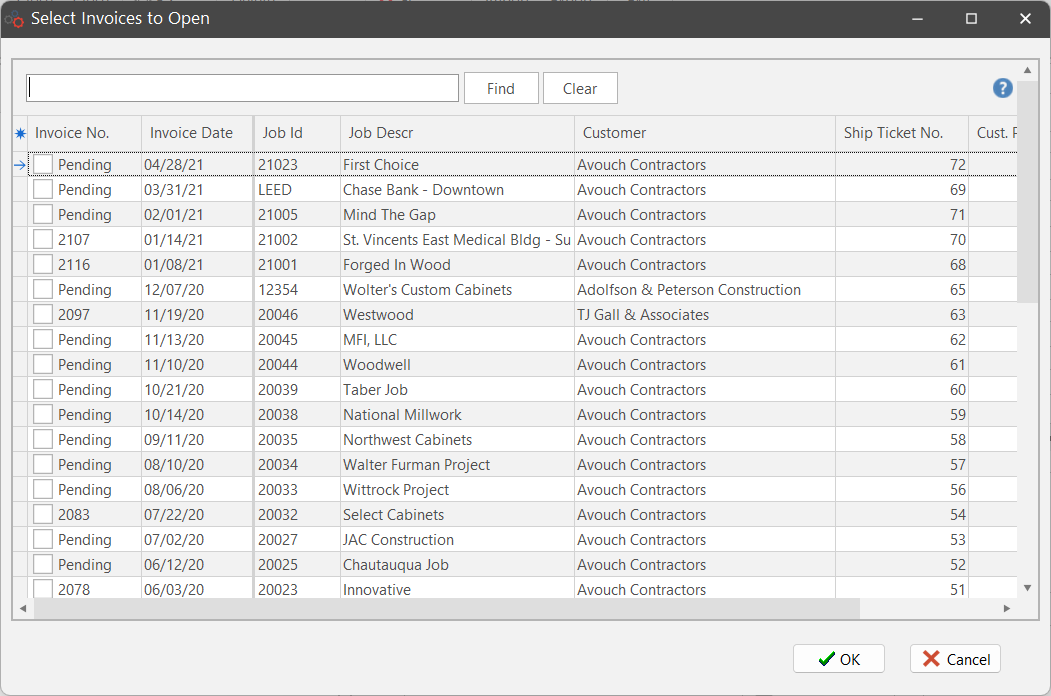 4. Select one or more invoices to open by clicking a check in the box.