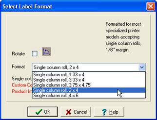 Roll Labels: When you select Product Labels, the label printing dialog box is displayed so you can indicate which roll label size you want to print. If your printer requires the label format to be rotated, you can check that option.