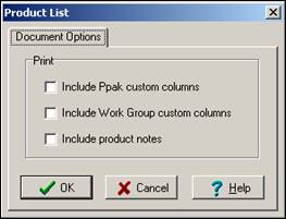 Prints products defined under the Job Item including product Id, description, work order, order quantity, ship quantity, and ship date. When you select the report, you can request that ProjectPAK custom columns, work group custom columns, and/or product notes be printed as well.