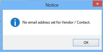If you attempt to email a purchase order but there isn't a contact or vendor email back on the corresponding ProjectPAK business or contact record, you'll receive the following warning message:
