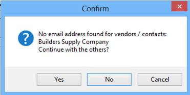 ShopPAK will create one email for each vendor participating in the Quote Request. Email addresses come from either the ProjectPAK vendor contact record, or the ProjectPAK vendor record. If an email doesn't exist, ShopPAK warns you with the following message…