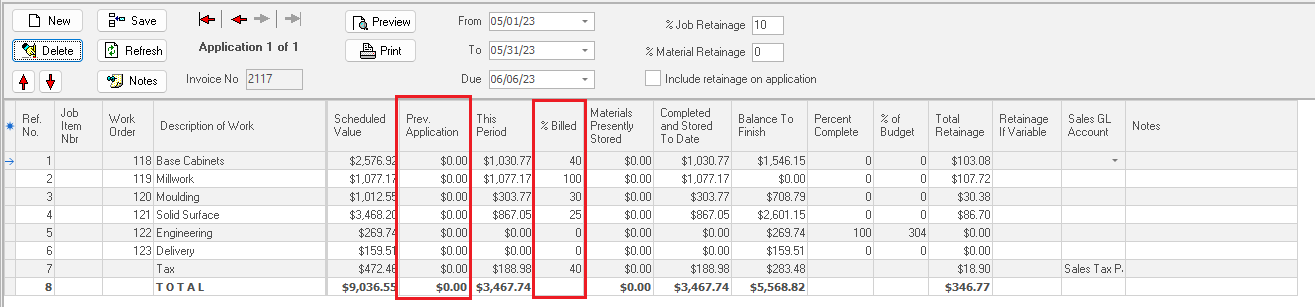 ShopPAK calculates “Previous Application” amounts from prior applications. “% Billed” also reflects the prior application percentages.