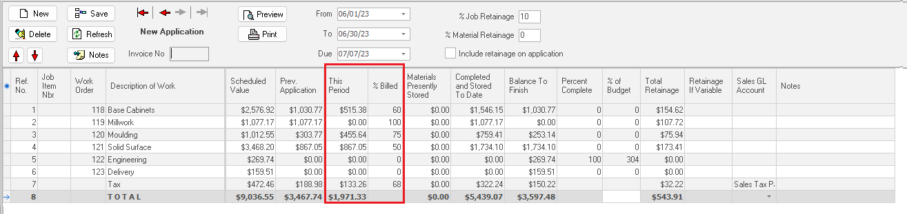 Identify the next billing period’s “From” and “To” dates, and either enter the amount of money to be billed this period into “This Period”, or enter the new “% Billed” percentage. Tabbing out of either cell recalculates related cells accordingly, as well as, sales tax and totals.