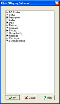 To hide / display columns, right mouse click the RFI grid and select “Hide / Display Columns” from the pop up menu. This displays the “Hide / Display Columns” dialog box.