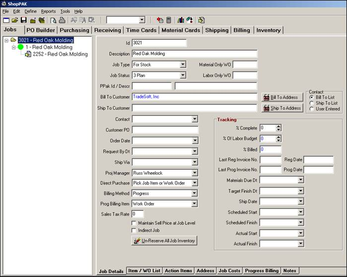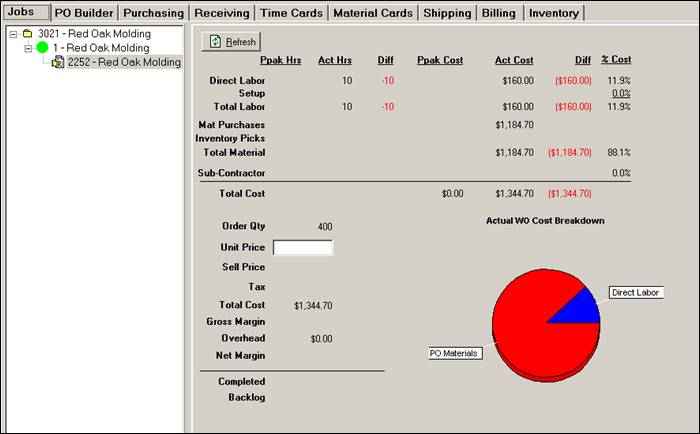 Once you select the ‘Make to Stock’ job, ShopPAK displays a job tree. Select the target work order that has the collected material and labor costs associated with fabricating this next batch of finished goods.
