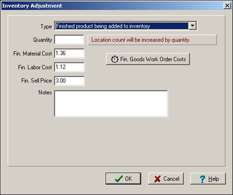 4. When the finished product or sub-assembly is completed, open the Finished Goods inventory item via the ‘Inventory Tab’. Select the inventory item location you want to add the new batch of products into, and right mouse click the location grid. Select “Adjustment” from the popup menu. This displays the “Inventory Adjustment” dialog box. Select “Finished product being added to inventory” from the “Type” pick box. This displays the “Fin. Goods Work Order costs” button.