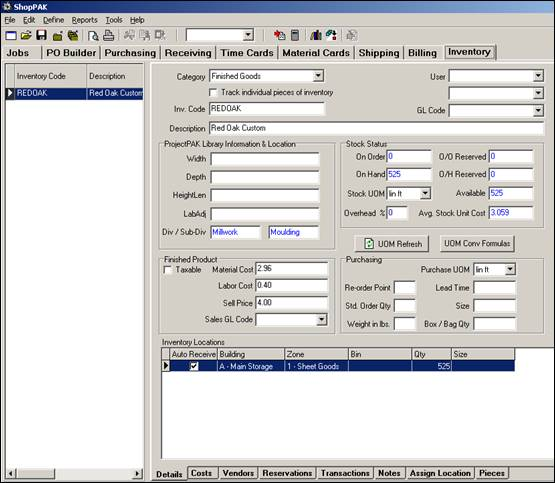 Click the OK button. ShopPAK updates the inventory item finished material and labor cost, finished sell price, new on hand counts, and the new calculated average stock unit price.