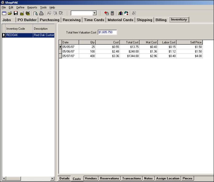 ShopPAK also creates the next purchase costing group on the ‘Costs’ sub tab.