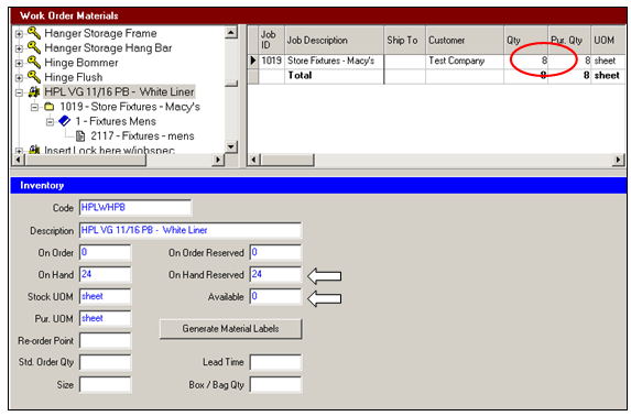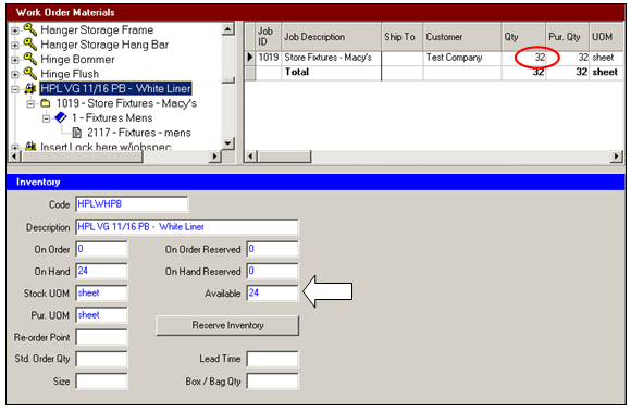 Clicking the “Reserve Inventory” button places a reservation against the 24 sheets for job 1019 leaving a difference of 8 sheets that still need to be purchased.