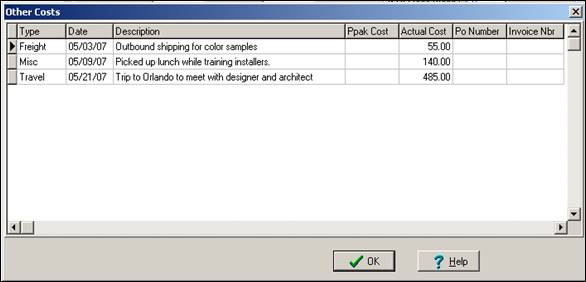 We manage miscellaneous job costs (Freight, Travel, and Miscellaneous) at the Job Item level. Clicking the Misc Job Costs button displays the Other Costs dialog box:
