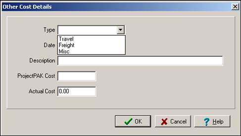2. Select New. This displays the Other Cost Details dialog box. Enter information about the miscellaneous cost and click OK.