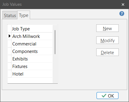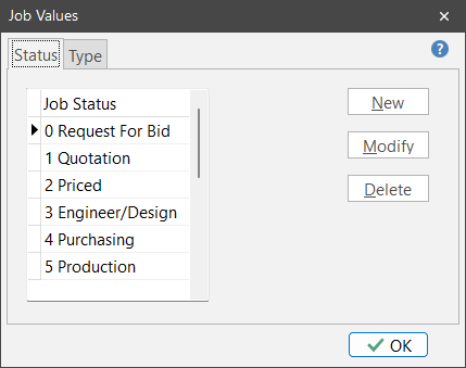 Before making your decision regarding job status, keep in mind that ShopPAK has a number of ways of tracking and measuring job progress. If you define and use “Department”, you’ll be able to see which department the job is in, without adding department-oriented status values. The other thing to keep in mind is Job Item and Work Order. A large job will have several Job Items and Work Orders. If this is the case, it makes more sense to focus on individual Job Item or Work Order status. In fact, it is impossible to get a reading as to where the overall job is at if you have a bunch of work orders in various stages of ‘Pending’, ‘Engineering’, ‘Purchasing’, ‘Released’, etc.