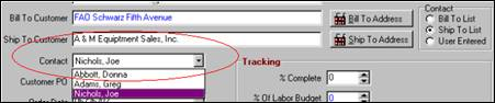 ShopPAK will provide a pick list of employees based on either Bill-To or Ship-To company employees for referencing the primary customer representative. ‘User Entered’ will allow you to simply type a freeform name if a Contact record has not been created in ProjectPAK.