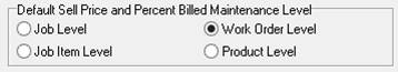 Sell Price can only be modified at the selected Maintenance Level. For example, when set to "Work Order Level", you can't alter sell price at the job or job item levels -- sell price will be disabled. Note, changes to work order sell price will automatically aggregate and roll-up into the parent job item and job levels. IMPORTANT….activities such as Invoicing or Direct Material Purchasing, should be consistent with the Maintenance Level of a job.
