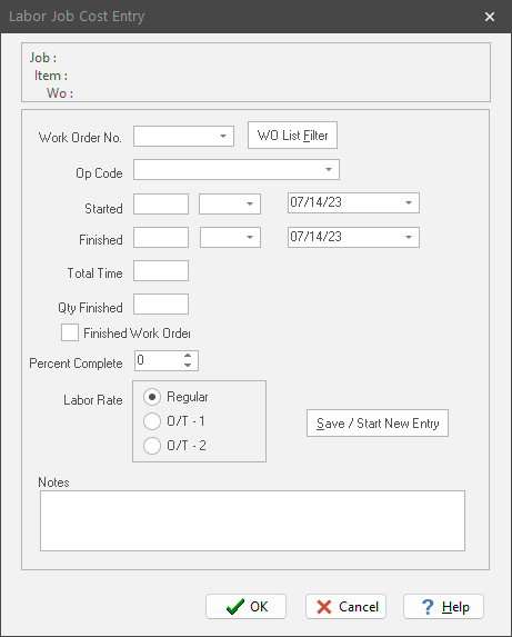 If you choose “Enter work order (no list)”, the “Labor Job Cost Entry” dialog box behaves differently. Instead of a work order pick list, you simply type the work order number into a regular edit box:
