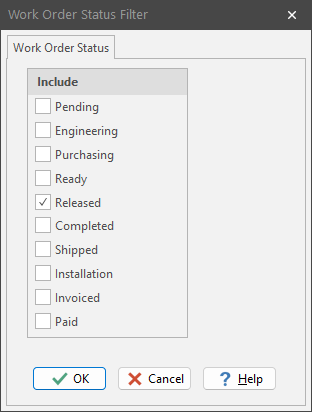 Tells ShopPAK what work orders to include in the list based on work order status. After clicking OK, ShopPAK refreshes the work order list accordingly.