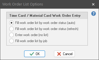 We give users 4 options with how they want to fill their work list and/or identify the “Job Cost” labor transaction. Selecting Define | Work Order List Options from the ShopPAK menu displays the “Work Order List Options” dialog box: