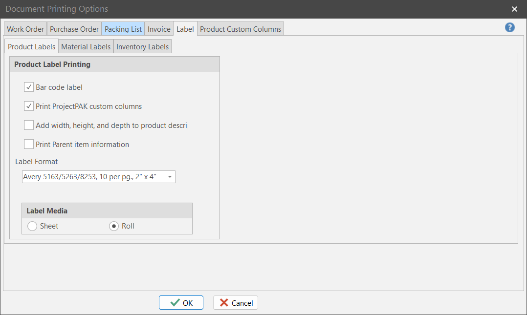 Label The fifth tab holds the label default document printing instructions. There are 3 sub tabs to select from: Product, Material and Inventory.