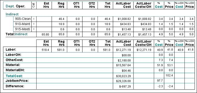Similar to the “by Department” labor actual report, but instead of showing a row for every approved labor actual against the job, it shows one aggregate line item per operation within department. At the end of the report, it shows summary line items for labor, labor with overhead, miscellaneous costs, material, material with overhead, total sell price and gross profit. It also shows percent of cost and percent of sell price percentage calculations.