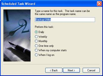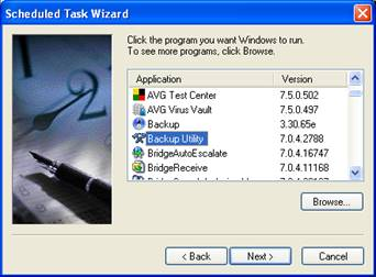 Create a scheduled task that runs our backup utility before running your system backup. Go to Start | All Programs | Accessories | System Tools | Scheduled Tasks | Add Scheduled Task. Choose Backup Utility from the list of programs. Click Next.