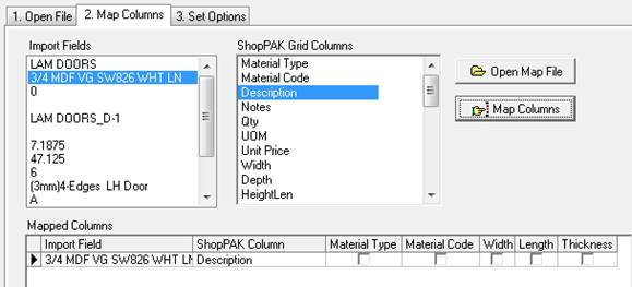 The second sub tab is used to map import file columns to their corresponding Material grid column.