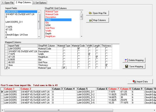 A handy feature is saving column mappings between sessions. If you plan on importing materials often into ShopPAK, and you’ll use the same import file layout, save the mappings and reuse over and over.