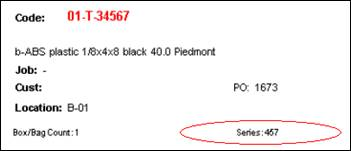 “Label Series” identifies a related set of material labels (e.g. “1 of 3”, “2 or 3”, “3 of 3”). This information is maintained on the Receiving form. If ‘Auto-generate Series’ is not enabled, any value you enter into this field will print at the base of each material label. In the example below, a value of 457 was entered into the Label Series column on the Purchasing, PO Item form. This information can also be updated upon receipt from the Receiving form.