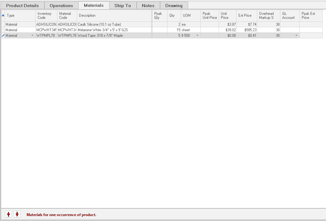 Materials The third sub tab, Materials, lists the materials needed to fabricate the product. Think of the Materials sub tab as the Material Requisition Sheet or the product Bill of Materials.