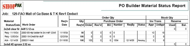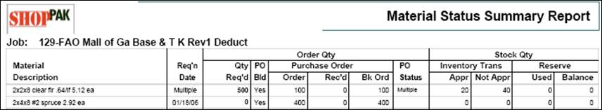 The Material Status reports are designed to report all material related activity linked to a Job. They reveal the entire material history for a Job including inventory reservations, shipments, inventory picks/returns and purchasing activity.