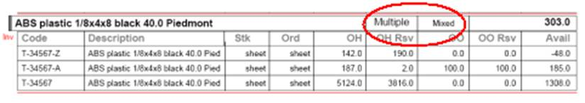 The Material Status Summary report prints cumulative totals for each type of material activity. When more than one transaction type exists, ShopPAK prints terminology such as ‘Multiple’ and ‘Mixed’ to represent a potential variety of transactions included in the total summary row for each material item.
